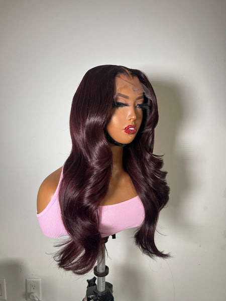 This unit is giving luxury, softness and scalp. Custom made using HD LACE 6x6 Closure & 3 Bundles of our Raw Virgin hair. The hair is COLORED to a DARK BURGUNDY, It brightens slightly in the sunlight and deepens when there's less light. Units comes customized & styled, it also...